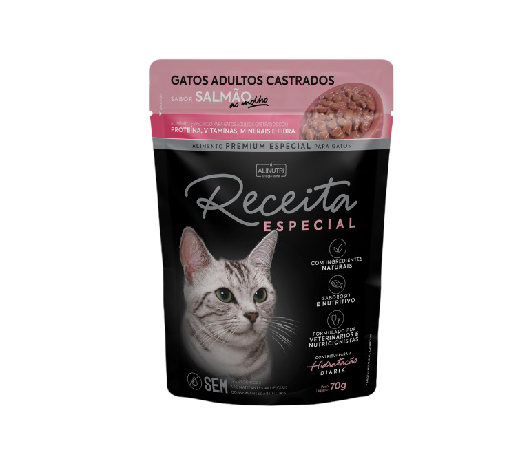 O produto SACHE UMIDO REC ESP PE GATO AD CAST SALMAO 70GR da ALINUTRI é uma excelente opção para quem busca recompensa saborosa para agrados, treino e enriquecimento para gatos.