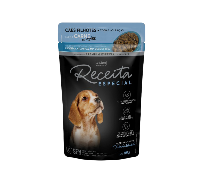 O produto SACHE UMIDO RECEITA ESP PE CAO FILHOTE CARNE 85GR da ALINUTRI é uma excelente opção para quem busca recompensa saborosa para agrados, treino e enriquecimento para cães.